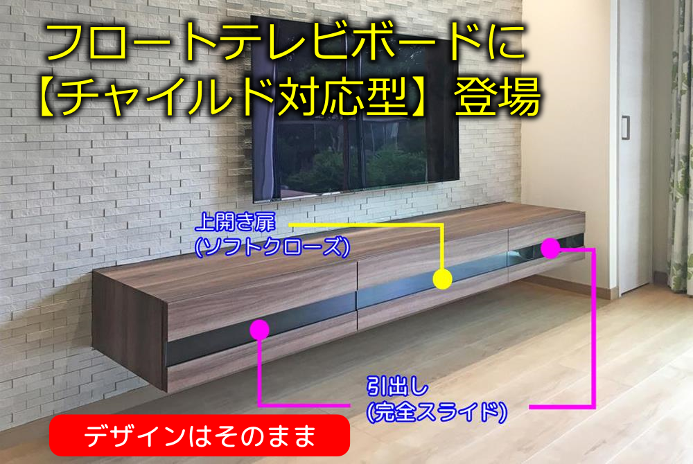 フロートテレビボードは小さな子供がいるので不安があると言う言葉が少なからずありましたのでこのたび【チャイルド対応型】を開発しました。