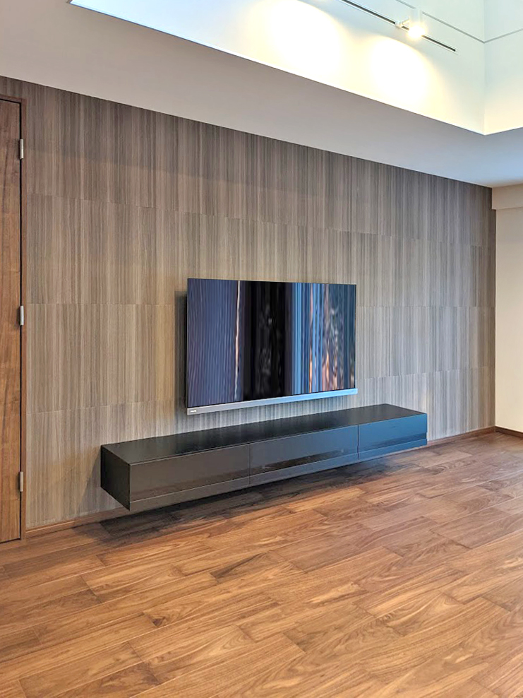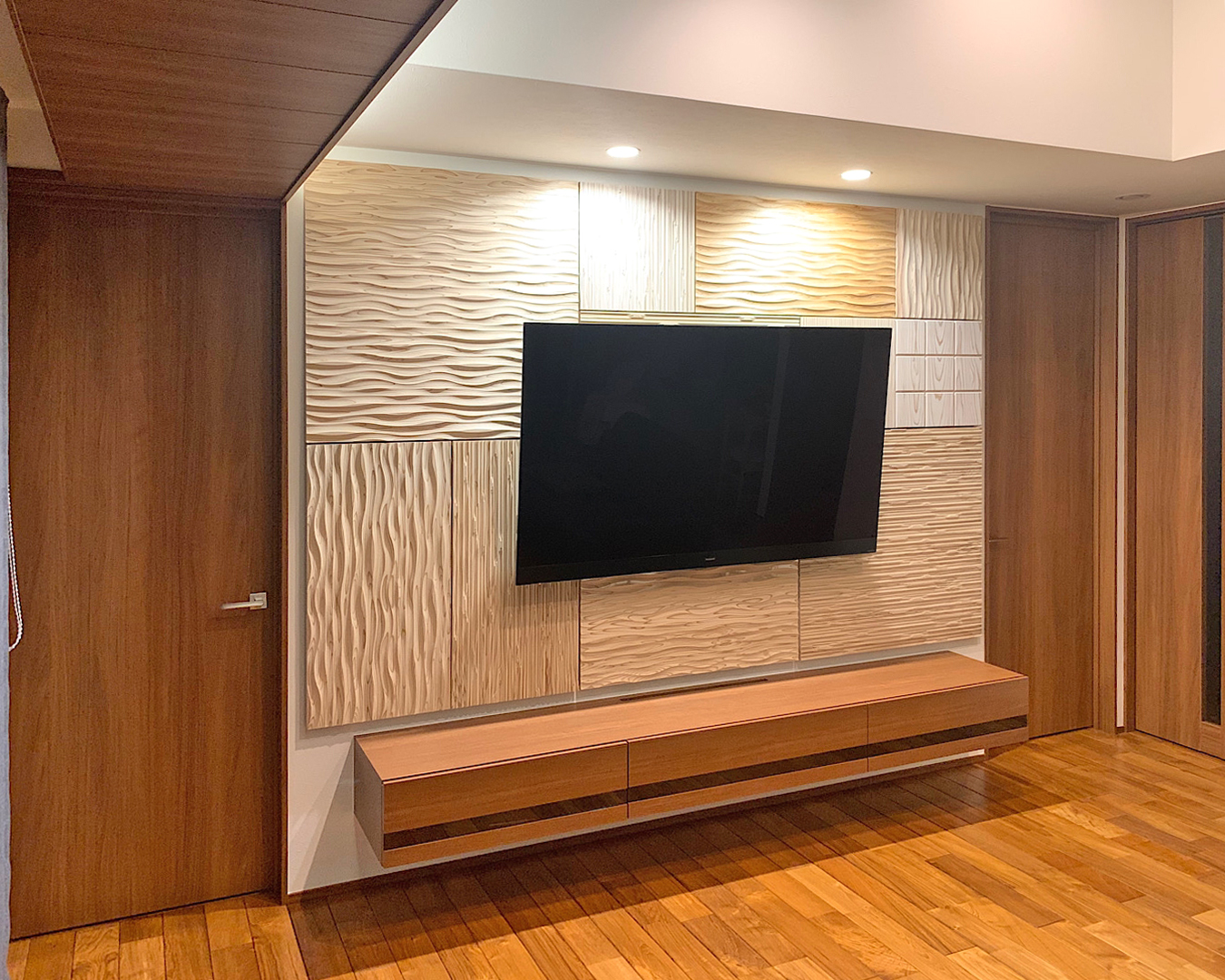 まず、サンプルをいくつも頼んだのですが、すぐに送って下さって、色味のチェックがしやすかったです。テレビボードを設置する壁面を石材にしているので、その雰囲気になるべく近くて、しかも存在感も出せる色味を探したところ、見事にマッチして、とても良い感じの仕上がりになりました。