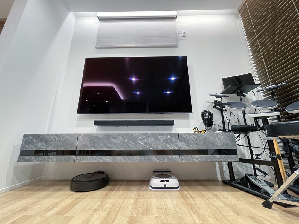 2700サイズの艶ありフロートテレビボード施工例「細かく計画されたインテリアは完成度が高い」