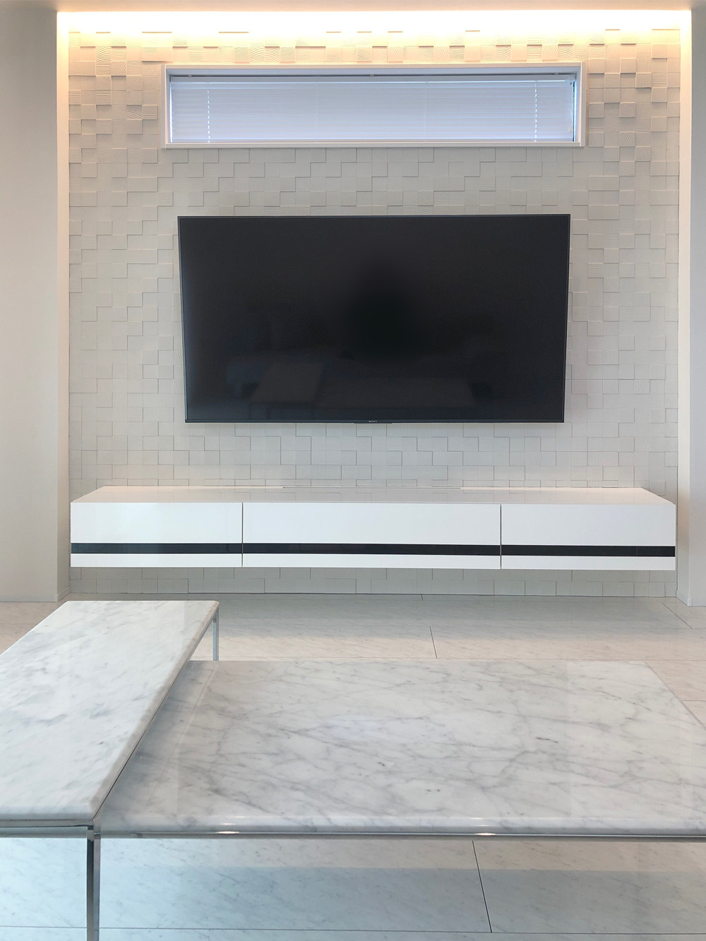 テレビボードはツヤありの物で、色は白の中でも温かみのある白が良いという希望がありました。