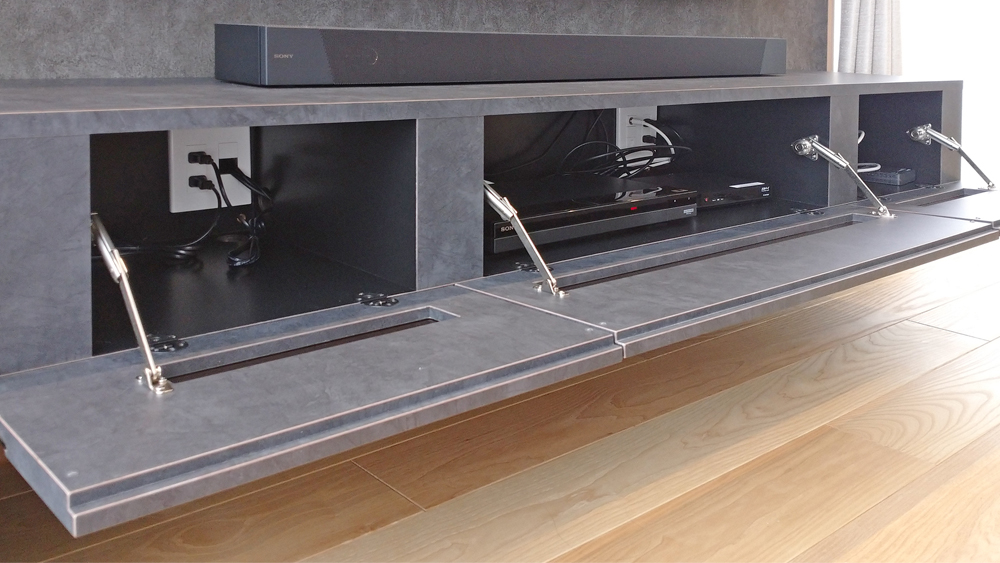 レコーダー収納部の扉を上開き型とし、両側は引出し収納にしたことです。
